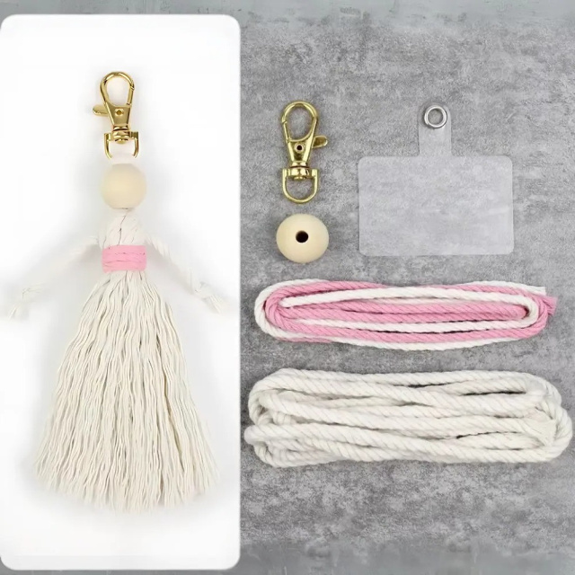 Набор макраме для рукоделия и плетения брелока «Куколка» для ключей и аксессуаров белый с розовым