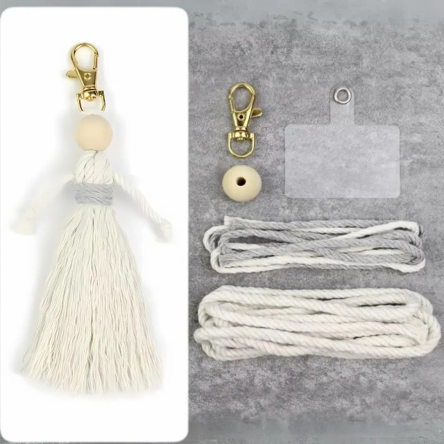Набор макраме для рукоделия и плетения брелока «Куколка» для ключей и аксессуаров белый с серым
