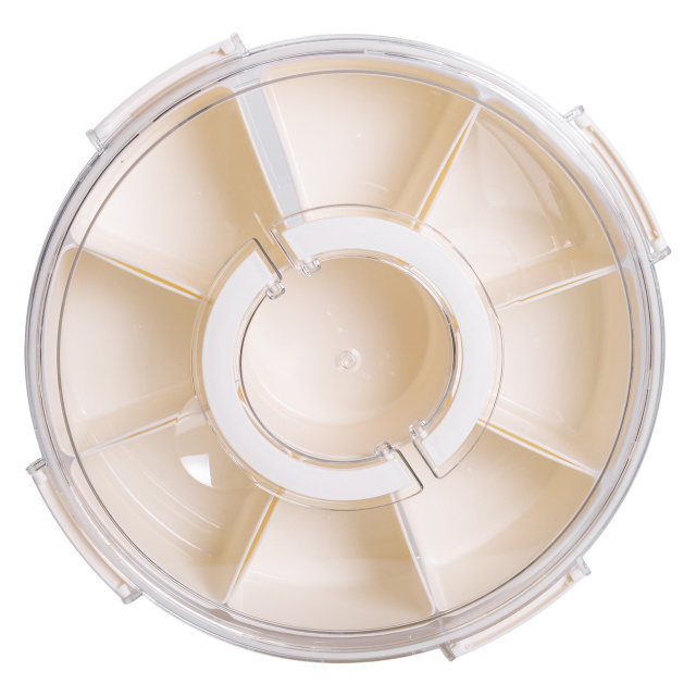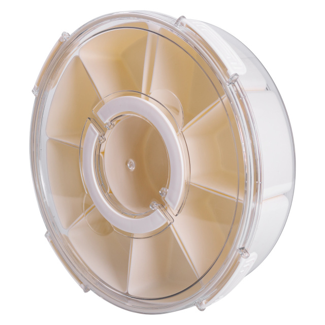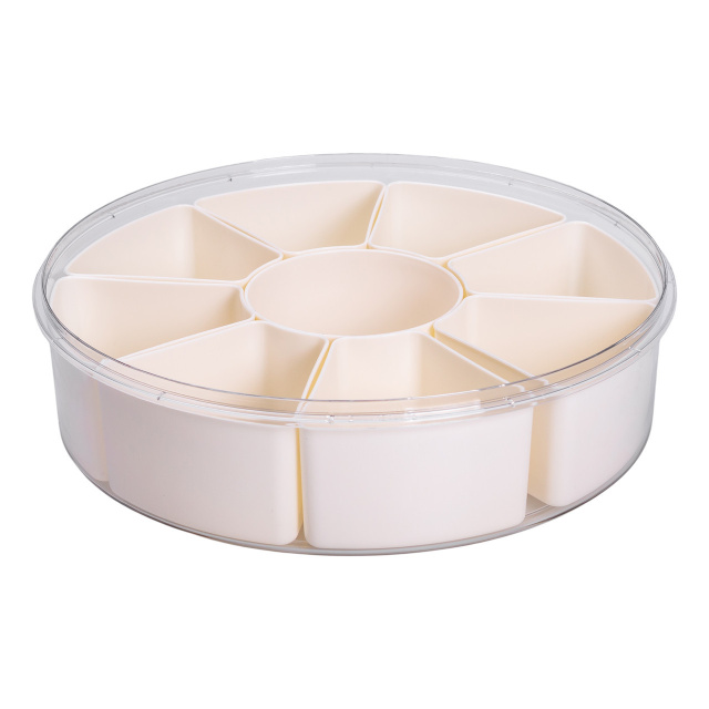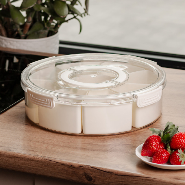 Контейнер предназначен для хранения различных видов специй, приправ или мелких сыпучих продуктов. Внутреннее пространство разделено на 9 отдельных отсеков, что позволяет компактно разместить несколько типов приправ в одной емкости без смешивания. Такой формат подходит как для ежедневного использования на кухне, так и для организованного хранения специй в шкафах или на полках. Контейнер предназначен для раздельного хранения продуктов - две отдельные секции позволяют хранить различные виды пищи без смешивания вкусов и запахов. Это удобно для хранения обеда, перекусов или готовых блюд. Благодаря компактной прямоугольной форме контейнер подходит как для домашнего использования, так и для транспортировки еды на работу или учебу. Основные характеристики: Диаметр: 29 см; Высота: 8 см; Размер отсека: 10х8.5х5.5 / 10х5.5 см; Объем контейнера: 3.5 л; Объем отсека: 300 мл; Количество отсеков: 9 шт; Материал: пластик. Контейнер имеет съемную решетчатую подставку, которая обеспечивает вентиляцию и отвод влаги. Такая конструкция помогает сохранять свежесть овощей, фруктов или других влажных продуктов. Контейнер легко моется и может использоваться повторно. Материал не впитывает запахов, устойчив к пятнам, а герметичная крышка плотно фиксируется, предотвращая протекание. Контейнер удобен для хранения в холодильнике, а также для использования в дороге. Крышка оснащена поворотным уплотнением, благодаря чему контейнер легко открывать и закрывать одним движением. Это особенно удобно во время приготовления блюд. Ручки с на крышке облегчают ее снятие и перемещение контейнера. Гладкая поверхность пластика предотвращает накопление остатков специй и упрощает уход. Контейнер изготовлен из пищевого пластика, не впитывает запахов и легко моется. Он подходит для повторного использования, помогая удобно организовать хранение приправ на кухне.
