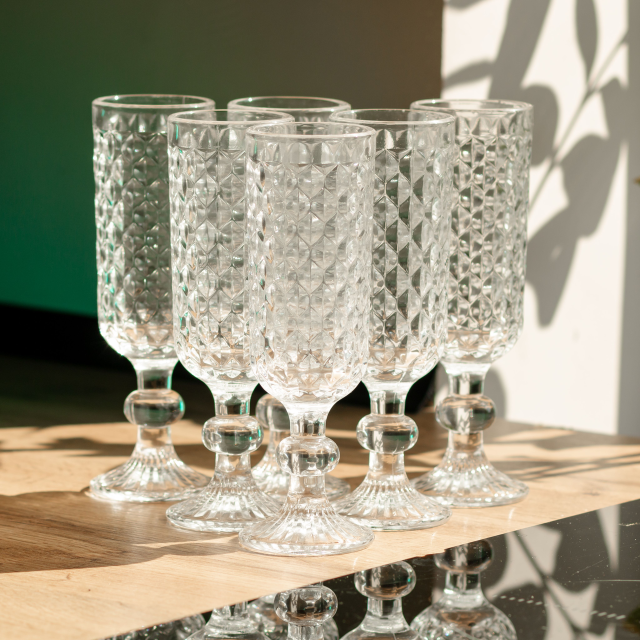 Бокалы для шампанского изготовлены из прозрачного стекла, которое отличается чистотой и блеском. Изделия имеют фигурную форму с декоративными изгибами, что добавляет композиционной выразительности. Конструкция состоит из короткой ножки и удлиненной высокой чаши, которая способствует лучшему сохранению игристости напитка. Основные характеристики набора бокалов для шампанского Набор: 6 штук; Объем: 160 мл; Высота: 18 см; Верхний диаметр: 5 см; Нижний диаметр: 6 см; Материал: стекло. Благодаря прозрачности стекла хорошо видно цвет и игру пузырьков в шампанском. Высокая чаша с узким отверстием уменьшает контакт напитка с воздухом, сохраняя аромат и насыщенность. Короткая ножка обеспечивает устойчивость на поверхности и одновременно позволяет удобно держать бокал, не нагревая содержимое. Бокалы подходят как для праздничной сервировки, так и для использования в ресторанах или дома. Их можно мыть вручную или в посудомоечной машине. Форма и объем бокала подобраны с учетом особенностей подачи игристых вин.