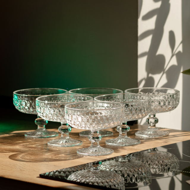 Креманки на ножке изготовлены из прозрачного стекла, которое отличается чистотой и характерным блеском. Изделия имеют фигурную форму с плавными изгибами, которые придают им выразительный вид. Конструкция дополнена прозрачной ножкой, которая обеспечивает удобное удержание и устойчивость на поверхности. Основные характеристики: Материал: стекло; Объем: 300 мл; Высота: 10 см; Верхний диаметр: 11 см; Нижний диаметр: 7 см; Назначение: для фруктов, мороженого, десертов. Благодаря широкой чаше креманки подходят для подачи десертов, мороженого, фруктов или желе. Прозрачное стекло позволяет эстетично презентовать содержимое, а гладкая внутренняя поверхность упрощает уход. Форма способствует комфортному использованию, а ножка не дает теплу рук нагревать содержимое. Креманки подходят как для ежедневного использования, так и для сервировки праздничного стола. Их можно мыть вручную или в посудомоечной машине. Изделия сочетают удобство, устойчивость и привлекательную форму для подачи десертов в домашних и профессиональных условиях.