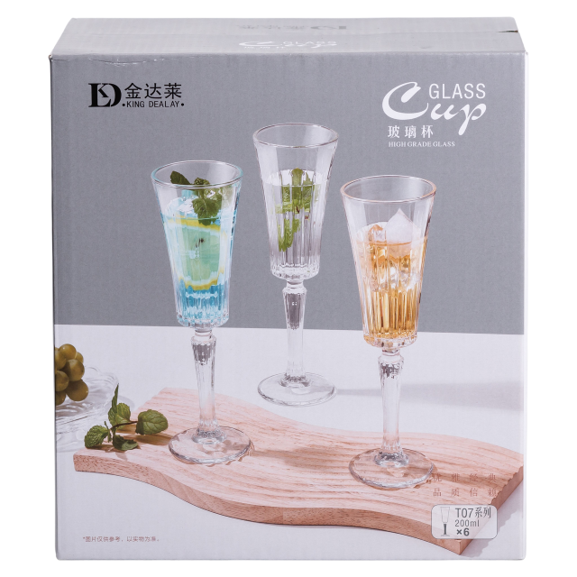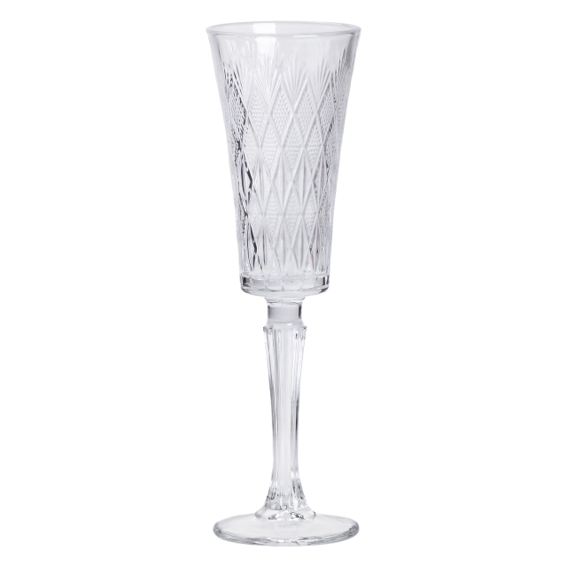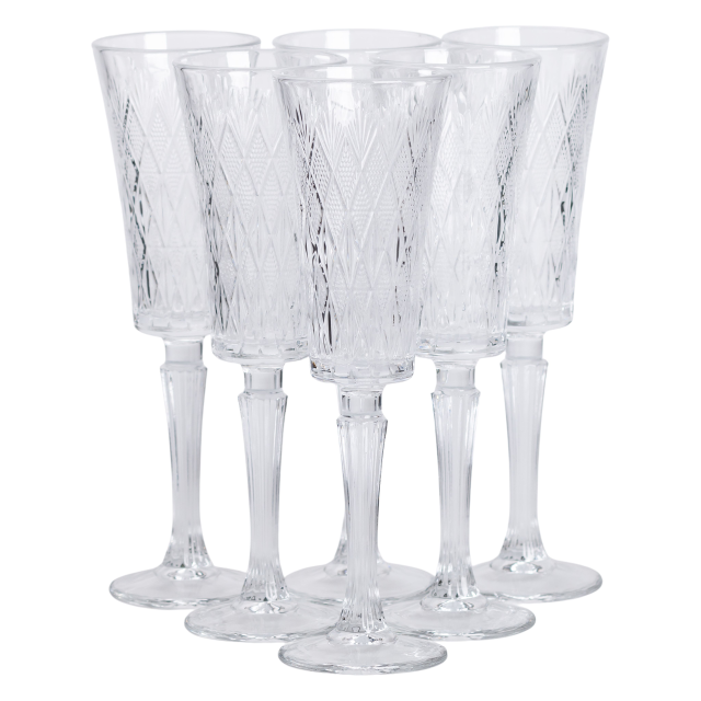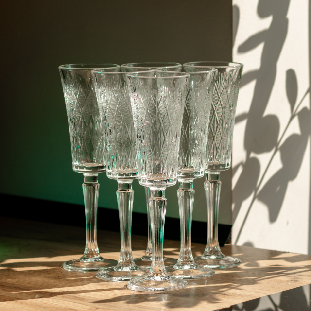 Набор бокалов изготовлен из прозрачного стекла, украшенного рельефным узором в виде геометрических граней. Вытянутая чаша плавно переходит в изящную высокую ножку с вертикальной гранью, что подчеркивает общую гармонию формы. Бокалы имеют классическую узкую форму, которая способствует сохранению игристости напитка. Основные характеристики набора бокалов для шампанского Набор: 6 штук; Объем: 200 мл; Высота: 23 см; Диаметр: 6.5 см; Материал: стекло. Благодаря удлиненной чаше бокалы идеально подходят для подачи шампанского и других игристых вин. Гравировка на стекле добавляет декоративности и эффектно преломляет свет, подчеркивая игру пузырьков. Высокая ножка позволяет держать бокал, не нагревая Бокалы уместны для праздничных событий, приемов и романтических вечеров. Они сочетают функциональность, удобство и эстетичность. Их можно мыть вручную или в посудомоечной машине с деликатным режимом.