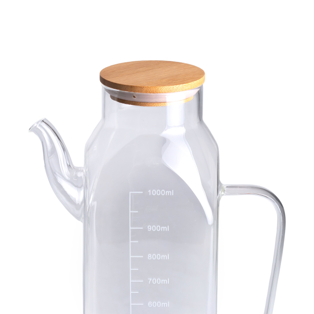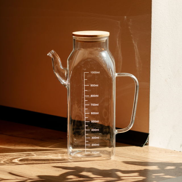 Чайник с мерной шкалой для масла и уксуса изготовлена из прозрачного боросиликатного стекла, устойчивого к перепадам температур и не впитывает запахов. Оснащен удобной ручкой и плотно закрывающейся крышкой, которая защищает содержимое от пыли. Основные характеристики: Объем: 1 л; Размеры: 8.5×8×22.5 см; Верхний диаметр: 6 см; Нижний размер: 8.5×8.5 см; Материал бутылки: стекло; Материал крышки: бамбук. Особенности: Широкое горлышко облегчает наполнение и мытьё; Наличие мерной шкалы позволяет точно дозировать объем; Универсальный дизайн впишется в интерьер любой кухни; Удобна в ежедневном использовании. Благодаря устойчивой основе емкость для масла стабильно стоит на любой поверхности, предотвращая случайное опрокидывание. Эргономичная форма обеспечивает комфортное наливание, а боросиликатное стекло позволяет видеть уровень и качество содержимого. Идеально подходит для ежедневного использования на кухне - как в домашних условиях, так и в профессиональной сфере. Можно использовать для подачи оливкового масла, уксуса, соевого соуса или других жидкостей. Практична в уходе, легко моется вручную или в посудомоечной машине.