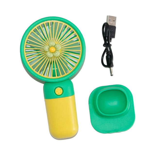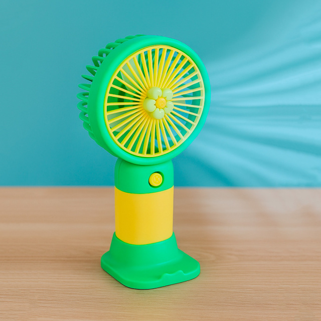 Этот мини вентилятор — настоящее спасение в жаркую погоду. Яркий зелёно-жёлтый корпус с декоративной цветочной серединкой придаёт устройству не только функциональность, но и эстетичность. Он идеально подойдёт для тех, кто хочет освежиться стильно и с комфортом.