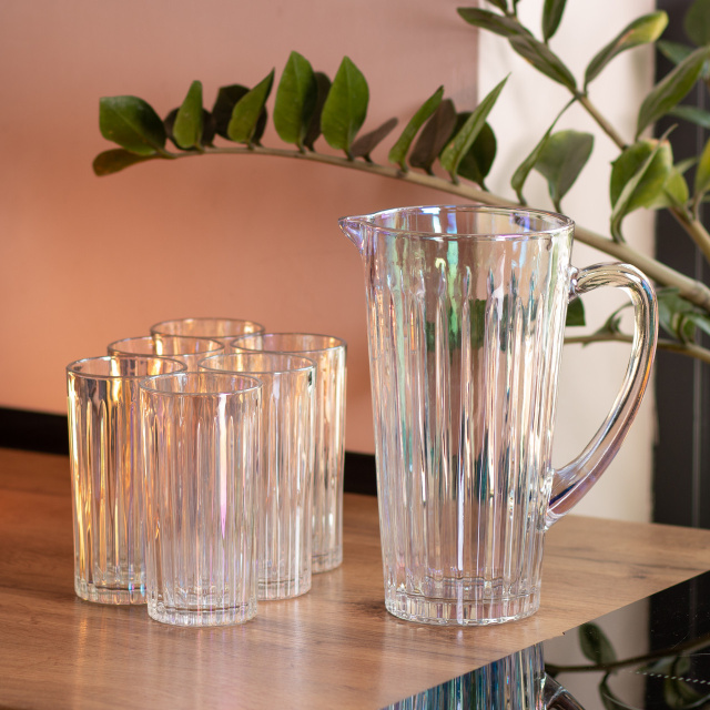Сервировка стола может быть одновременно практичной и стильной — особенно с универсальным набором стеклянной посуды для повседневного использования и праздничных случаев. В комплект входит прозрачный кувшин с вертикальным рельефным узором и шесть стаканов, выполненных в том же дизайне. Все элементы изготовлены из прочного стекла, которое не впитывает запахи, устойчиво к царапинам и легко очищается. Кувшин оснащён удобной ручкой и широким носиком для аккуратного наливания. Объём идеально подходит для подачи воды, лимонада, сока или домашнего компота. Стаканы имеют комфортную форму, хорошо лежат в руке и подходят как для холодных, так и для тёплых напитков. Лаконичный и универсальный дизайн делает набор отличным дополнением к любой посуде. Он будет уместен и в повседневной сервировке, и на праздничном столе. Практичный и эстетичный, этот набор подойдёт как для дома, так и в качестве подарка. Характеристики набора стаканов с кувшином Высота кувшина: 23 см; Диаметр кувшина: верх - 12 см, низ - 9 см; Высота стаканов: 13.5 см; диаметр стаканов: верх - 7 см, низ - 6 см; Объем кувшина: 1.2 л; Объем стаканов: 320 мл; Материал: стекло; Количество предметов: 7 (6 стаканов + 1 кувшин). Кувшин имеет эргономичную ручку и носик для комфортного наливания жидкости, объем позволяет удобно сервировать напитки для семьи или гостей. Стаканы имеют классическую цилиндрическую форму, достаточную вместимость для порционного использования, а также толстые стенки для повышенной прочности. Все части набора легко очищаются вручную или в посудомоечной машине. Этот комплект подходит для подачи воды, компота, лимонада, сока и других безалкогольных напитков как в домашних условиях, так и в заведениях питания. Благодаря простому дизайну из прозрачного стекла набор гармонично вписывается в любой интерьер кухни или сервировки стола.