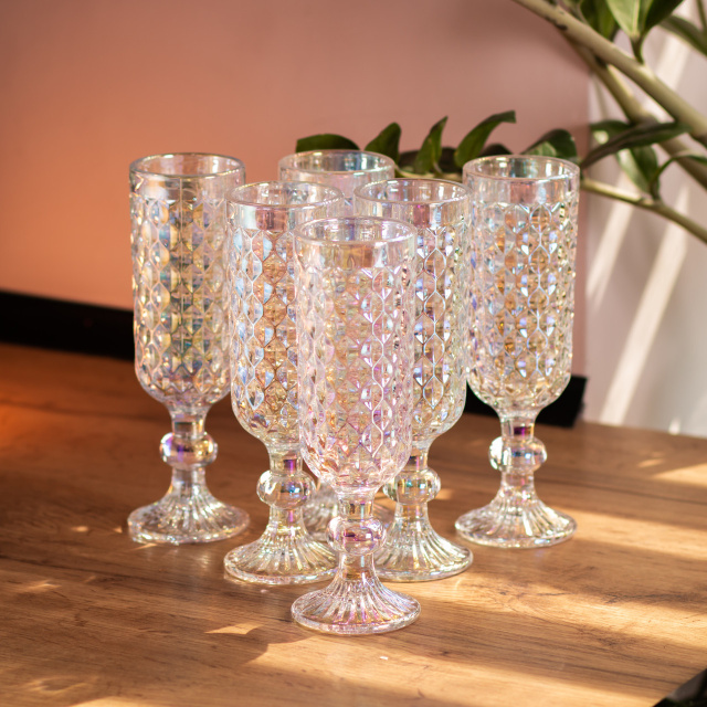 Набор бокалов для шампанского изготовлен из прочного прозрачного стекла с выразительной ребристой фактурой. Классическая форма и универсальный дизайн делают их идеальными как для подачи игристых вин, так и для коктейлей или воды — как в домашних условиях, так и в заведениях общественного питания. Толстое стекло обеспечивает не только прочность и устойчивость к повреждениям, но и делает бокалы подходящими для частой мойки, включая посудомоечную машину. А благодаря сочетанию лаконичной формы и текстурированной поверхности, они легко вписываются в любой стиль сервировки — от классики до минимализма. Основные характеристики набора бокалов для шампанского Набор: 6 штук; Объем: 160 мл; Высота: 18 см; Верхний диаметр: 5 см; Нижний диаметр: 6 см; Материал: стекло. Этот набор бокалов для шампанского станет удачным выбором для тех, кто ценит сочетание стиля, удобства и качества. Благодаря универсальному дизайну и прочному исполнению, бокалы подойдут как для повседневного использования, так и для особых случаев. Они не только украсят ваш стол, но и сделают каждую встречу с близкими ещё более тёплой и запоминающейся.