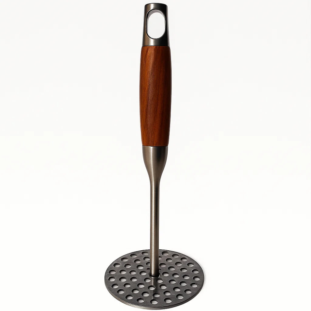 Картофелемялка для пюре — незаменимый кухонный инструмент для быстрого и удобного приготовления пюре из картофеля, моркови, кабачков, гарбузов и других овощей. Рабочая часть аксессуара изготовлена из прочной пищевой нержавеющей стали, устойчивой к деформации, коррозии и высоким температурам. Она эффективно разминает овощи, не повреждая посуду и обеспечивая однородную консистенцию пюре. Удобная деревянная ручка приятно лежит в руке, не скользит и не нагревается при использовании, что делает работу более комфортной и безопасной. Основные характеристики толкушки для пюре: Длина: 26 см; Диаметр решетки: 9 см; Материал рабочей части: нержавеющая сталь; Материал ручки: дерево. Толкушка для картофеля с деревянной ручкой — это практичный и долговечный аксессуар, который упростит процесс приготовления любимых блюд и станет полезным помощником на любой кухне.