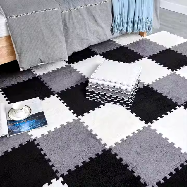 Плюшевый пол-пазл — это модульные напольные плитки из EVA-пены с мягким текстильным покрытием. Каждый элемент (30 x 30 см) оснащен замковыми соединениями, что позволяет легко складывать их в большой коврик любой формы. Плюшевая поверхность делает коврик комфортным, теплым и мягким для пола. Идеально подходит для детских комнат, игровых зон, мест отдыха, теплых и мягких ковриков на пол. Материал основы: EVA пена — термопластичный полимер, обеспечивающий гибкость, теплоизоляционные и амортизационные свойства. Текстильный слой: плюшевый ворс из полиэфирных волокон, устойчив к износу, не мнется и быстро высыхает. Уход прост: покрытие легко моется и сохраняет мягкость, имеет антискользящий эффект благодаря текстурированной основе и антистатическим добавкам. Характеристики: Размеры: 30 x 30 см Толщина: основной слой 1 см + плюшевый ворс 0.6 см Вес: 150 г / шт. Простая сборка и возможность комбинировать разные цвета