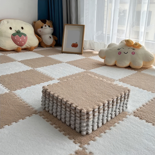 Коврик-пазл с плюшевым покрытием - это практичное решение для создания мягкого, теплого и безопасного пола. Набор состоит из 20 модульных плиток размером 30x30см, которые легко соединяются, образуя поверхность размером 120x150см. Замковые соединения позволяют легко собрать коврик нужной формы, добавляя комфорт и стиль в ваш дом. Мягкое плюшевое покрытие обеспечивает тепло и приятные тактильные ощущения, что делает коврик идеальным для детских комнат, игровых зон и мест отдыха. Основа из EVA-пены гарантирует гибкость, амортизацию и теплоизоляцию, создавая уют даже на холодном полу. Этот коврик универсальное решение для дома. Он устойчив к износу, легко моется и имеет текстурированную антискользящую основу для дополнительной безопасности. Характеристики: Размер коврика в сборе: 120x150см Количество плиток в наборе: 20шт Размер одной плитки: 30x30см Высота: 1см основа + 0.6см плюшевый слой Материал основы: EVA-пена Материал покрытия: плюшевый текстиль Подходит для создания индивидуального дизайна пола( можно заказать нужный цвет из ассортимента)