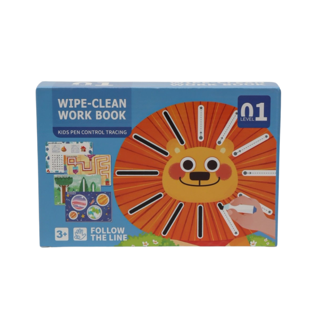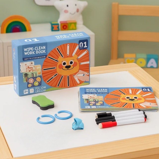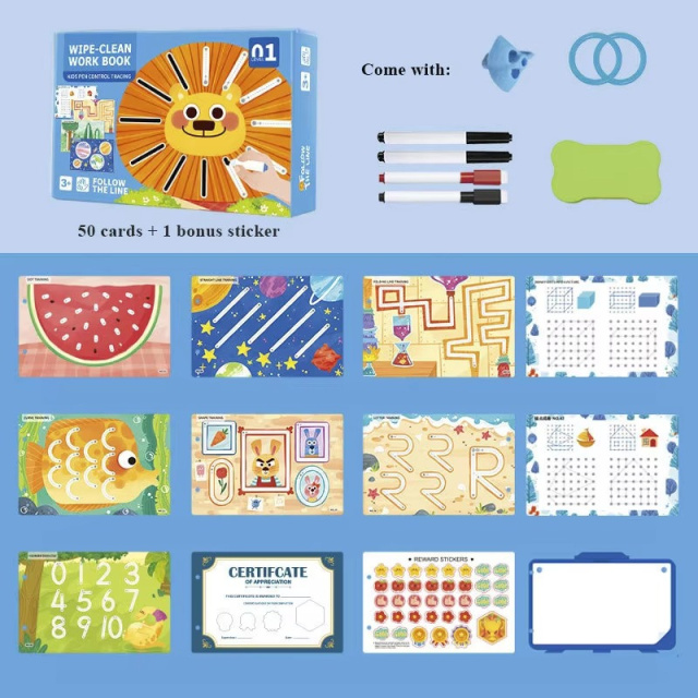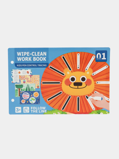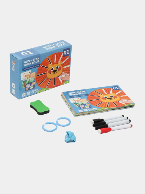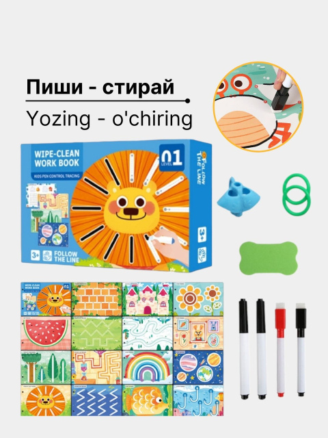 Тетрадь формата 21.7 х 14.7 х 5.3 см удобно брать с собой в дорогу или использовать дома. В комплект входят два маркера, стирательная резинка, наклейки для поощрения успехов, а также карточки с сертификатами для наград. Все страницы многоразовые — можно рисовать и стирать, что делает набор долговечным и практичным для многократных занятий.