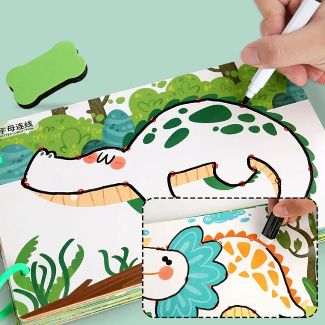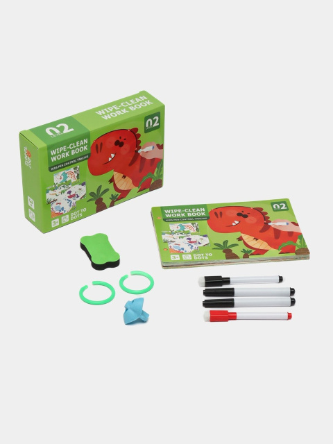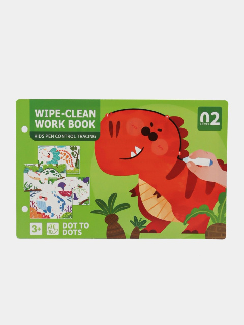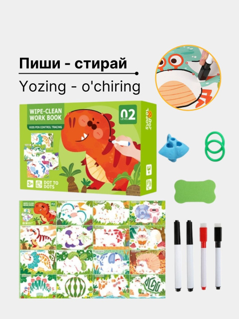Тетрадь формата 21.7 х 14.7 х 5.3 см удобно брать с собой в дорогу или использовать дома. В комплект входят два маркера, стирательная резинка, наклейки для поощрения успехов, а также карточки с сертификатами для наград. Все страницы многоразовые — можно рисовать и стирать, что делает набор долговечным и практичным для многократных занятий.
