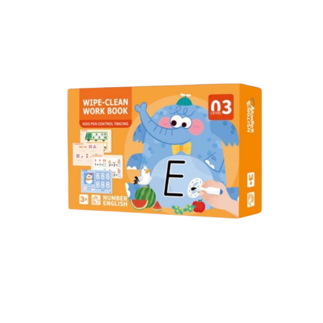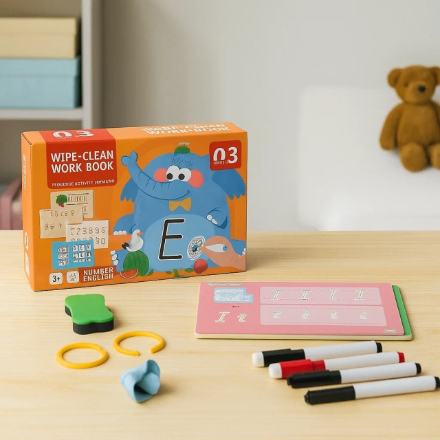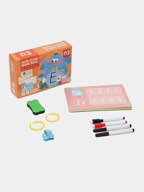 Тетрадь формата 21.7 х 14.7 х 5.3 см удобно брать с собой в дорогу или использовать дома. В комплект входят два маркера, стирательная резинка, наклейки для поощрения успехов, а также карточки с сертификатами для наград. Все страницы многоразовые — можно рисовать и стирать, что делает набор долговечным и практичным для многократных занятий.