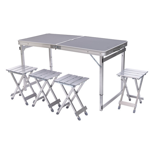 Раскладной комплект мебели с алюминиевым каркасом подходит для использования на природе, даче или в кемпинге. Складная конструкция позволяет удобно трансформировать все элементы в один чемодан для транспортировки и хранения. В сложенном виде стол и стулья компактно фиксируются, занимая минимум места. Каркас выполнен из лёгкого и надёжного металла, что обеспечивает прочность и долговечность при ежедневном использовании. Поверхности из алюминия и МДФ износостойкие и устойчивы к внешним воздействиям. Высота стола регулируется — 75, 65 или 55 см, что позволяет настроить удобное положение под разные условия. В центре столешницы предусмотрено отверстие для установки зонта — это обеспечивает защиту от солнца или дождя. Характеристики кемпингового набора для отдыха: Размеры стола в разложенном виде: 120 x 70 x 75 / 65 / 55 см; Размеры стола в сложенном виде: 60 x 70 x 10 см; Цвет: черный; Материал столешницы: МДФ; Материал каркаса (опор): алюминиевая трубка; Размер стульев: 28 x 26 x 39 см; Материал каркаса стульев: алюминий; Материал сидений стульев: алюминий. Назначение туристического набора: для кемпинга, пикников, рыбалки; как мобильный вариант для дачи или сада; для сезонных мероприятий на природе; для удобной транспортировки и хранения. Вся конструкция легко складывается и раскладывается без дополнительных инструментов. Набор станет практичным решением для тех, кто ищет компактную, функциональную мебель для отдыха на открытом воздухе.