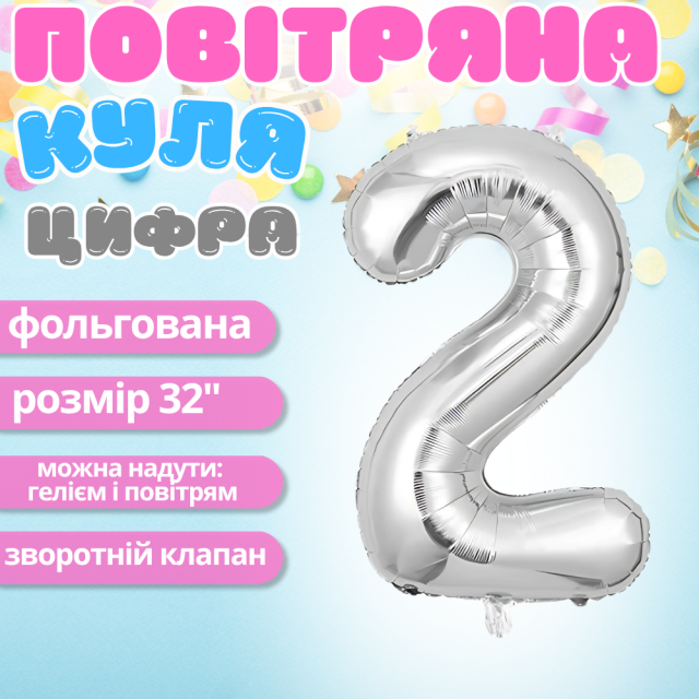 Воздушный шар в виде цифры 2 серебро,32 дюйма, фольгированый, для праздников для дня рождения, юбилеев,