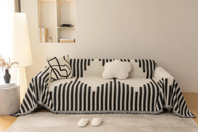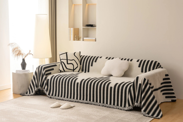 Плед-покрывало размером 180×230 см выполнено из прочного текстиля шенилл, который отличается износостойкостью и мягкой текстурой. Оно может использоваться как плед, покрывало или накидка для защиты мягкой мебели. Светлая основа дополнена выразительным черным узором в виде расходящихся дугообразных линий с мелкими зубчатыми элементами, напоминающими стилизованные листья или перья. Такой дизайн добавляет интерьеру графичности и современного характера, делая пространство более стильным и уютным. Особенности: Размер 180×230 см Материал износостойкий шенилл Многофункциональность: плед, покрывало, чехол-накидка Узор в виде дугообразных линий с эффектом листьев/перьев Контрастное сочетание черного и белого цветов