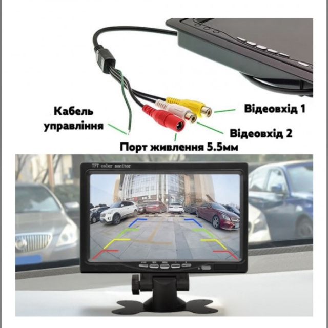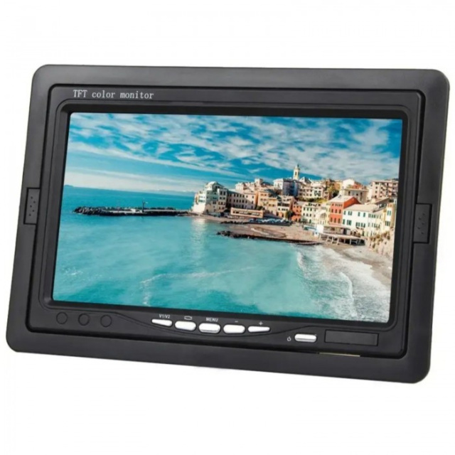 Автомобильный монитор предназначен для подключения автомобильных аналоговых камер заднего или переднего вида. Как правило устанавливается в грузовом транспорте, спецтранспорте, селькохозяйственной технике, погрузчиках, жд транспорте. Данная модель предусматривает подключения 2-ух камер.Преимущества монитора:· Оптимальные размеры дисплея как раз подходят для большого транспорта;· 2-а варианта установки. Монитор можно установить на ножку которая идет в комплекте или же в монтажную рамку (в комплекте не идет);· Автоматическое переключение изображения между камерами;· Поддержка 24 Вольта дает возможность устанавливать его не только в легковые, но и грузовые автомобили.Поддержка PAL и NTSC В мониторе предусмотрена поддержка камер 2-ух видеостандартов — PAL и NTSC. Теперь не нужно подбирать камеру, дисплей сам подстроиться под нужный ему стандарт.Качественный дисплей Монитор укомплектован матрицей с разрешением 800×480 пикселей. Этого более чем достаточно для подключения аналоговой камеры. Также предусмотрена регулировка яркости и контрастности дисплея. Изображение на дисплее яркое и насыщенное. Никаких шумов, размытости и искажений.Регулируемый кронштейн Установив на торпеду дисплей можно регулировать по углу наклона, а также поворачивать дисплей для удобства пользования. Регулируйте угол наклона дисплея и поворот как вам удобно. Для этого достаточно отпустить регулировочный винт и установить нужное положение.ИК пультДля удобства управления в комплекте есть инфракрасный пульт. С помощью него можно удобно настраивать необходимые опции, а именно регулировать яркость, контрастность и цветность дисплея.Характеристики:· Диагональ: 7" / 16:9;· Разрешение экрана: 800х480;· 2-канальный видео вход: V1/V2 автоматическое переключение;· Поддерживаемые ТВ системы: NTSC/PAL;· Размеры экрана: 155х85 мм;· Размер монитора: 174х113х19 мм;· Питание: 9-45В / до 8Вт;· Рабочая температура: от -20°С до 50°С· С кнопками меню можно настроить яркость, контрастность, оттенок и т.д.· Низкое энергопотребление· Подключение: красный (+), черный (-), зеленый - управление. Есть возможность включения монитора только при подаче 12В (например при включении заднего хода), в остальное время экран выключен. Комплектация:· Монитор;· Кронштейн;· Пульт;· Двусторонняя наклейка для монтажа кронштейна;