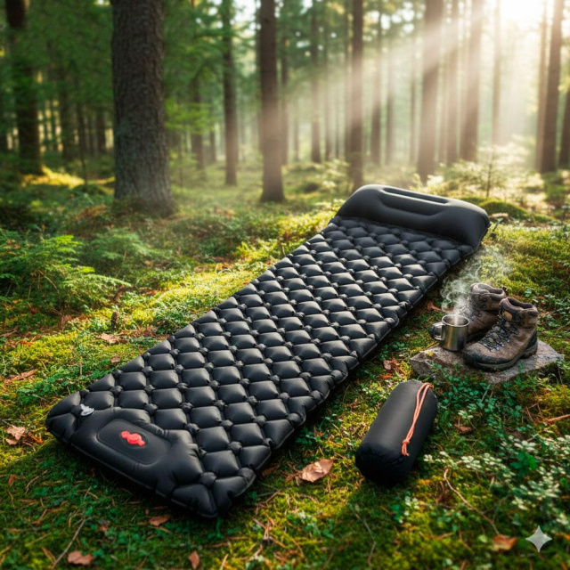 Встроенный насос: Матрас надувается за 1–2 минуты нажатием ноги или руки. Вам больше не нужно надувать каремат ртом или брать с собой отдельный тяжёлый насос.