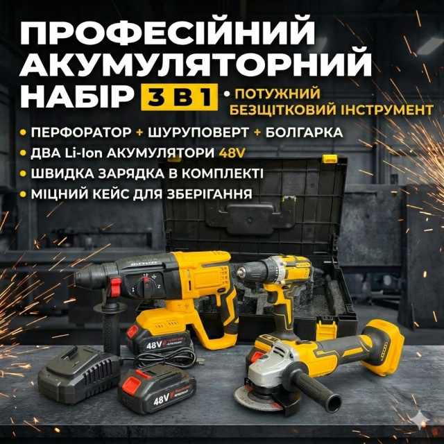 Описание Универсальный аккумуляторный набр инструментов 3 в 1 — это мощное решение для профессиональных строительных работ и бытового использования. В комплект входят три самых востребованных инструмента: бесщеточный перфоратор, двухскоростной шуруповерт и высокооборотистая угловая шлифовальная машина (болгарка). Все инструменты работают на единой аккумуляторной платформе 48V, что обеспечивает полную автономность и мобильность на объекте без привязки к электросети. Инструменты отличаются высокой производительностью, надежной сборкой и эргономичным дизайном с прорезиненными вставками для комфортного хвата. Весь набор поставляется в прочном пластиковом кейсе для удобной транспортировки и хранения.