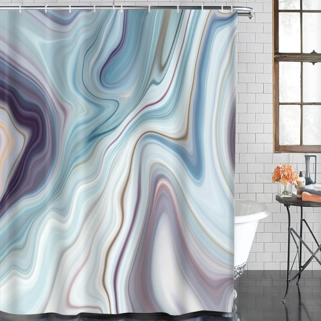 Шторка для ванной и душа с кольцами 180x180 см водоотталкивающая, шторка для душевой и ванной с крючками, мраморно-голубая