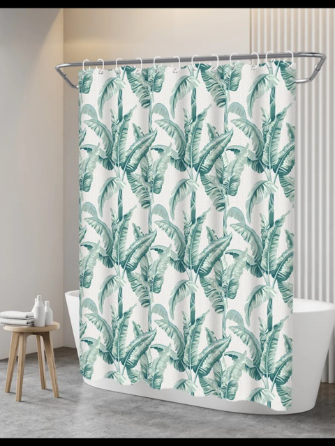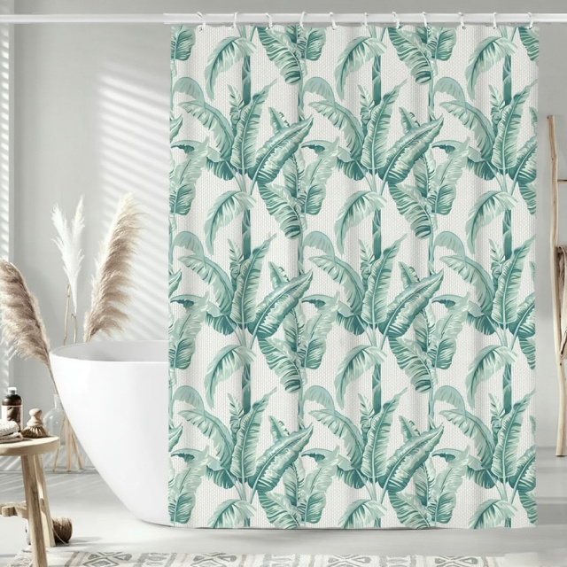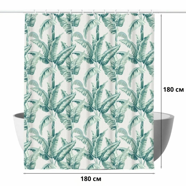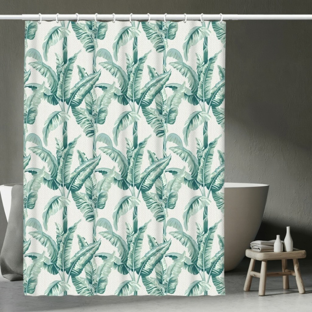 Узор на шторке для ванной выполнен в тропическом стиле. На светлом фоне изображены крупные зелёные листья бананового дерева, расположенные плотным ритмичным рисунком. Листья имеют разные оттенки зелёного — от светло-мятного до насыщенного изумрудного, что создаёт эффект глубины и объёма. Принт выглядит свежо и натурально, добавляя в интерьер ощущение уюта и атмосферы экзотического курорта.