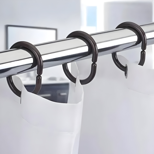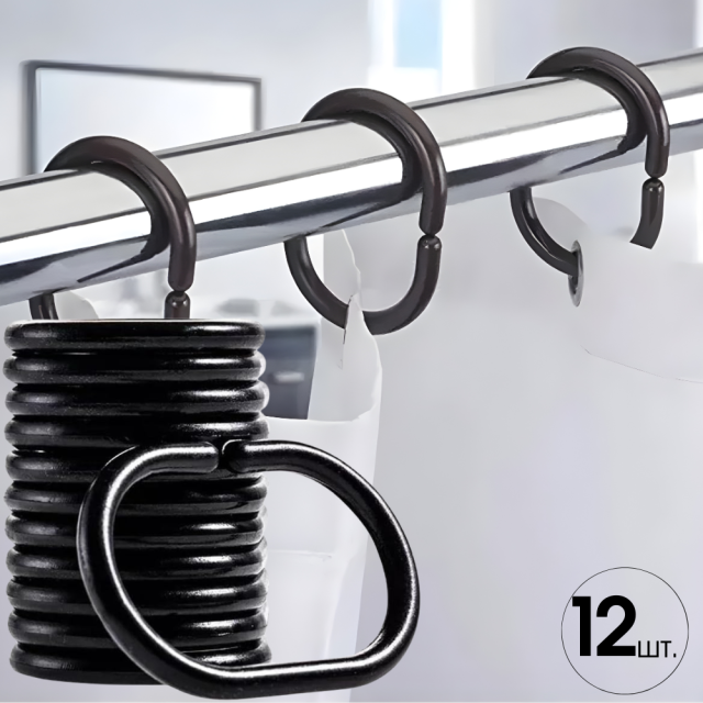 Набор пластиковых колец-крючков для шторки в ванную комнату — практичное и удобное решение для крепления душевой занавески. Кольца выполнены из прочного ПВХ, устойчивого к влаге и коррозии. Благодаря "С"-образной форме крючки легко надеваются на карниз и обеспечивают плавное скольжение шторки без заеданий. Черный цвет придаёт стильный и современный вид ванной комнате. Подходит для всех стандартных карнизов и штор. Характеристики: Тип: кольца-крючки для шторки Материал: ПВХ (пластик) Форма: "С"-образная Цвет: черный Количество в наборе: 12 шт Назначение: для ванной комнаты, душевой шторки