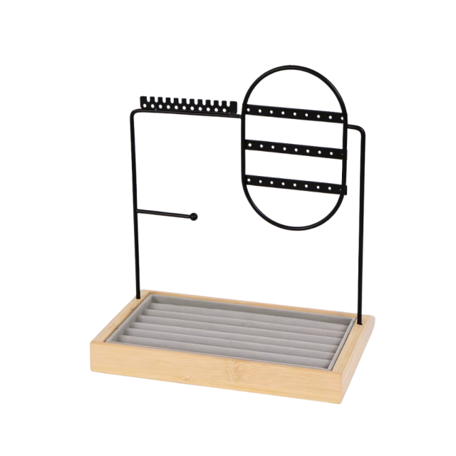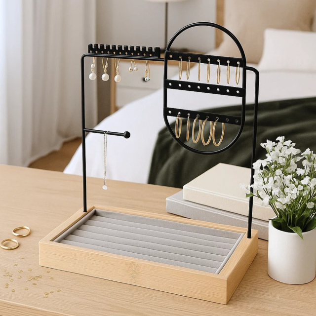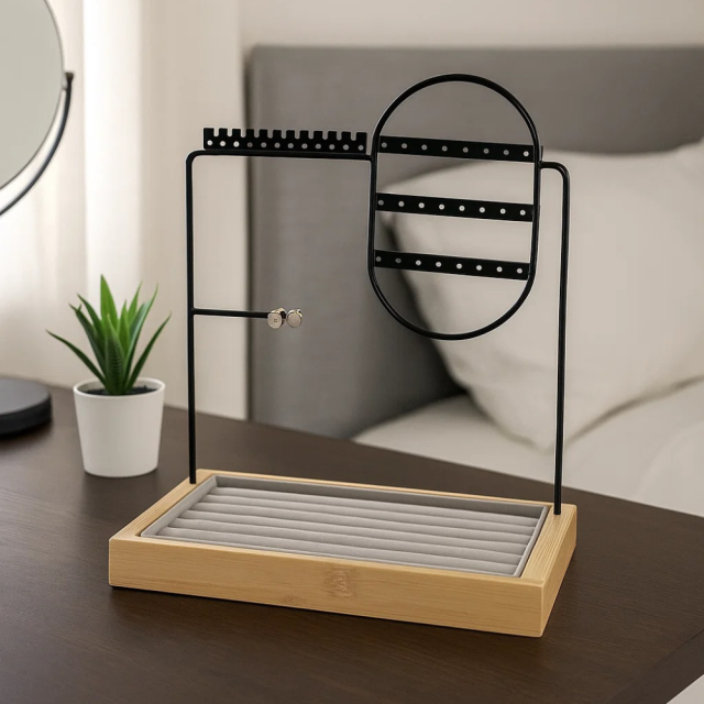Органайзер для украшений с деревянным основанием и металлической стойкой — стильное и практичное решение для хранения бижутерии и аксессуаров....
