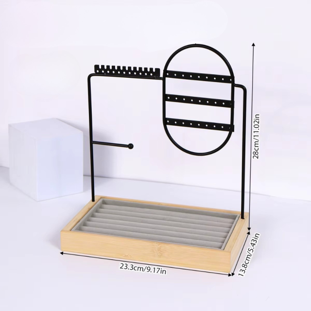Органайзер для украшений с деревянным основанием и металлической стойкой — стильное и практичное решение для хранения бижутерии и аксессуаров. Основание выполнено из натурального дерева с бархатной вставкой, которая бережно удерживает кольца, серьги и браслеты. Металлическая стойка с отверстиями и перекладинами идеально подходит для подвесных украшений, цепочек и сережек, предотвращая их спутывание. Благодаря универсальному дизайну органайзер гармонично впишется в современный интерьер спальни, гардеробной или магазина украшений. Конструкция продумана до мелочей — металлическую стойку можно устанавливать как спереди, так и сзади в зависимости от удобства использования. Характеристики: Размеры: 28×23.3×13.8 см Материал основания: натуральное дерево Внутренняя отделка: бархат Материал стойки: металл Назначение: хранение сережек, колец, браслетов, цепочек, аксессуаров