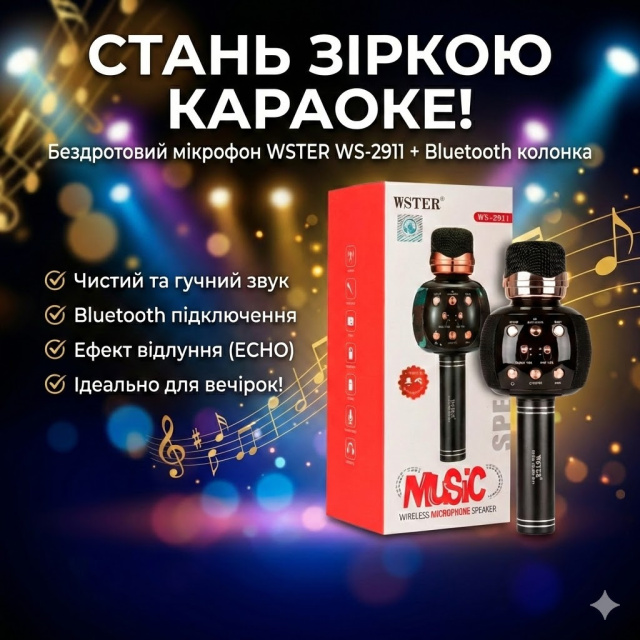 Описание → WSTER WS-2911 — это обновленная версия легендарного караоке-микрофона, созданная для тех, кто ценит качественный звук и функциональность. В отличие от бюджетных моделей, этот микрофон оснащен усиленным динамиком с глубокими басами и уникальной функцией «Vocal Remover»: одним нажатием кнопки вы можете заглушить голос исполнителя в любой песне, превратив её в готовую фонограмму. Стильный эргономичный дизайн, встроенный модулятор голоса (4 режима: от детского до монстра) и возможность записи своего пения делают WS-2911 идеальным центром развлечений. Подключайтесь к смартфону по Bluetooth, вставляйте флешку или карту памяти — и устраивайте концерт где угодно: дома, на природе или в автомобиле.