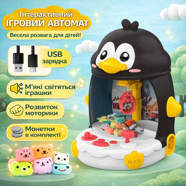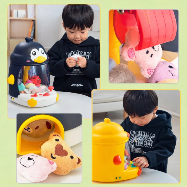 Интерактивная игрушка в виде пингвина предлагает детям увлекательное и развивающее занятие. Она функционирует как мини-манипулятор: с помощью кнопок управления ребёнок может перемещать лапку-захват для извлечения игрушек из прозрачного пространства. Этот процесс способствует развитию мелкой моторики, внимательности и координации движений.