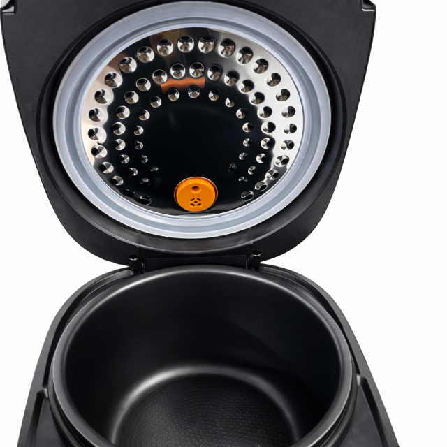 Мощность рисоварки составляет 900 Вт. Управление осуществляется с помощью сенсорной панели с цифровым дисплеем, расположенной на верхней части корпуса. Устройство поддерживает 10 программ приготовления, что позволяет использовать рисоварку для разных типов блюд.