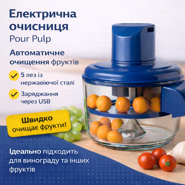 Электрическая очистительница Pour Pulp - это удобное кухонное устройство для быстрой и аккуратной очистки винограда и других фруктов от кожуры. Благодаря мощному мотору и острым лезвиям из нержавеющей стали устройство эффективно снимает кожуру, сохраняя целостность и свежесть плодов. Компактный дизайн и питание от аккумулятора делают его идеальным для домашнего использования.