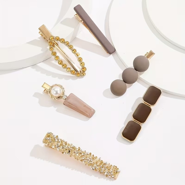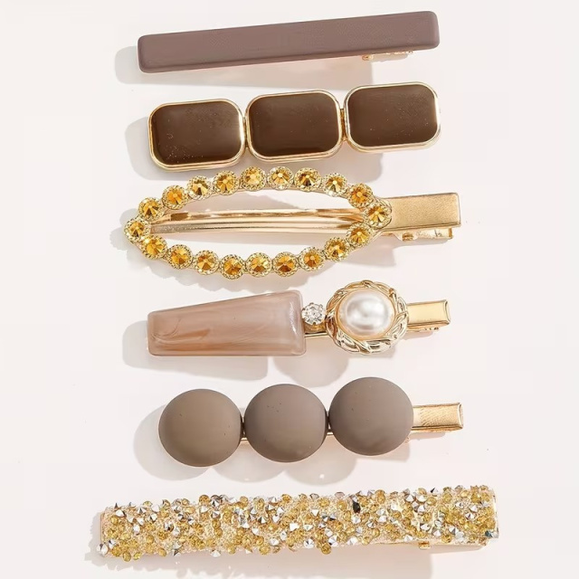 Набор женских заколок для волос в элегантном бежево-золотом стиле — стильный аксессуар для повседневных и праздничных образов. В комплект входят 6 заколок с разным дизайном: с декоративными кристаллами, жемчужным элементом, геометрическими формами и матовым покрытием. Гармоничное сочетание теплых бежевых оттенков и золотистой фурнитуры делает набор универсальным — заколки отлично дополнят как деловой, так и вечерний образ. Аксессуары надежно фиксируют волосы, подходят для разных типов и длины волос. Можно носить по одной или комбинировать между собой для создания стильных причесок. Характеристики: Тип: набор заколок для волос Количество в наборе: 6 шт Цвет: бежевый,коричневый, золотистый Материал: металл, пластик, декоративные элементы (стразы, жемчуг) Тип крепления: зажим Назначение: для повседневных и праздничных причесок