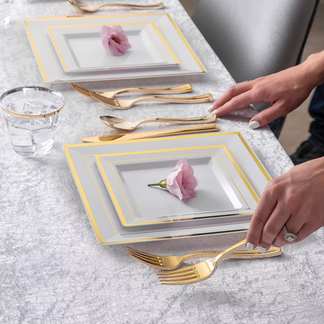 Набор тарелок пластиковых 12 шт квадратные,десертные 16.5 см и обеденные 24 см, с золотистым контуром