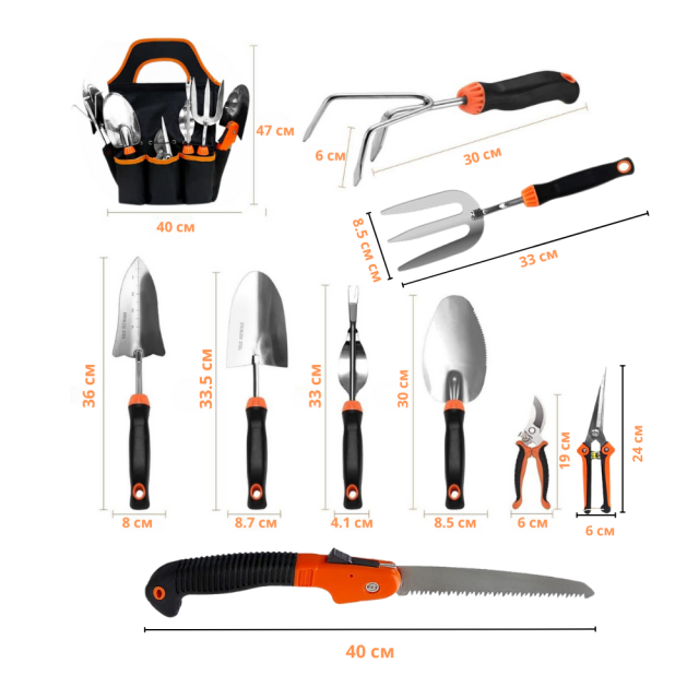 Основные особенности набора — высокая прочность материалов, удобная переноска благодаря сумке, эргономичный дизайн инструментов и их многофункциональность, что делает этот комплект незаменимым помощником для любого садовода.