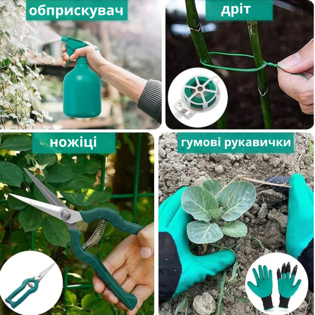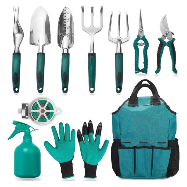 В наборе представлены все необходимые инструменты для работы в саду: большой совок для пересадки растений без повреждения корней, удобный инструмент для прополки, уникальный культиватор с трехзубым дизайном для удаления растительности и рыхления почвы, а также ручные грабли для уборки листвы и мусора. Кроме того, в комплекте имеется сумка для хранения, ножницы для обрезки веток, перчатки, защищающие от порезов, и лопатка для пересадки с измерительными метками. Все инструменты удобно хранить и использовать в межсезонье благодаря эргономичной ручке.