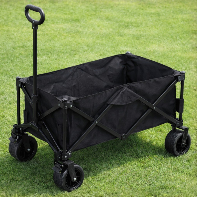 Тележка оснащена регулируемой по высоте ручкой (76–99 см), что обеспечивает комфортное управление. Модель оборудована четырьмя широкими 8-дюймовыми tank-колесами (17×10 см), которые обеспечивают отличную проходимость по песку, траве, грунту и неровной поверхности. Легко складывается для удобного хранения и транспортировки.