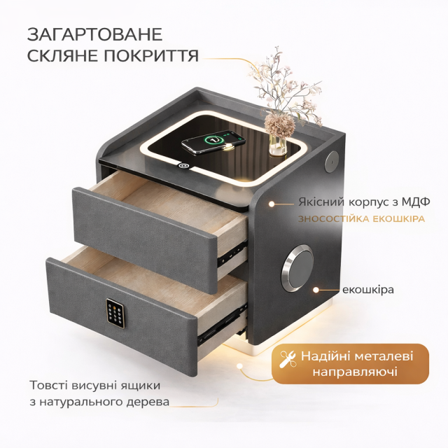 Умная зарядка: Столешница из закаленного стекла поддерживает быструю беспроводную зарядку смартфонов. Также на боковой панели предусмотрены порты USB и Type-C для зарядки нескольких устройств одновременно.