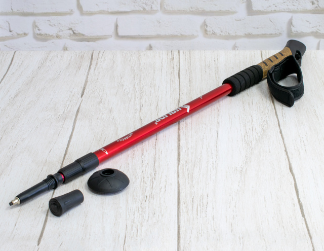Треккинговая телескопическая палка для скандинавской ходьбы имеет трехсекционную регулируемую конструкцию.