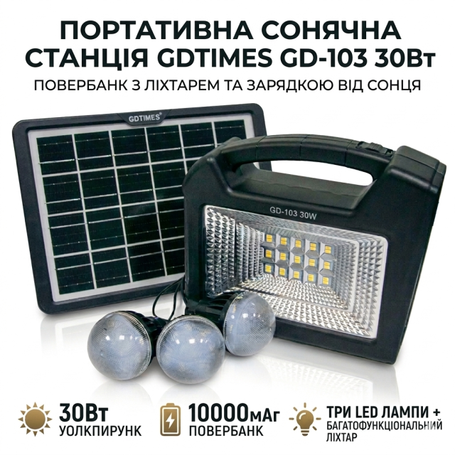 GDTIMES GD-103 — это не просто кемпинговый фонарь, а полноценная мини-электростанция, работающая на бесплатной энергии солнца. Благодаря мощному встроенному аккумулятору и входящей в комплект солнечной панели, вы получаете полную энергетическую независимость. Устройство совмещает в себе функции яркого поискового фонаря, лампы для чтения и повербанка с солнечной батареей, что позволяет заряжать телефоны, чтобы всегда оставаться на связи.