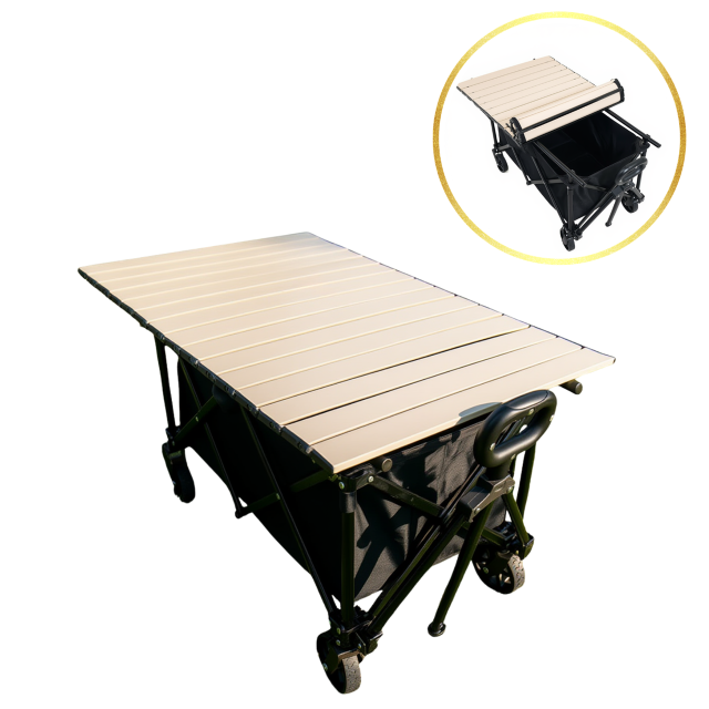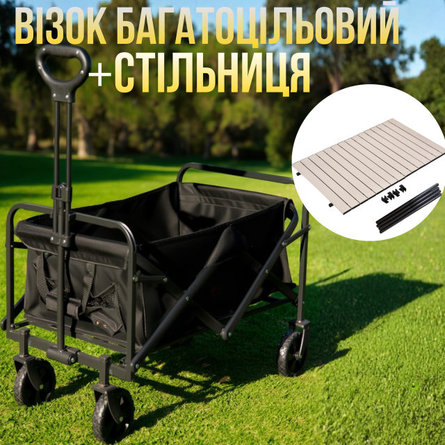 В комплект входит железная столешница, которая устанавливается на тележку и превращает её в удобный мобильный стол для пикника, приготовления пищи или размещения различных предметов. Столешница выполнена из прочного металла и сворачивается в рулон, благодаря чему занимает минимум места при хранении и перевозке.