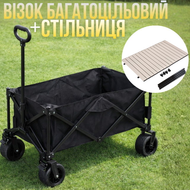 В комплект входит железная столешница, которая устанавливается на тележку и превращает её в удобный мобильный стол для пикника, приготовления пищи или размещения различных предметов. Столешница изготовлена из прочного металла и сворачивается в рулон, благодаря чему занимает минимум места при хранении и перевозке.