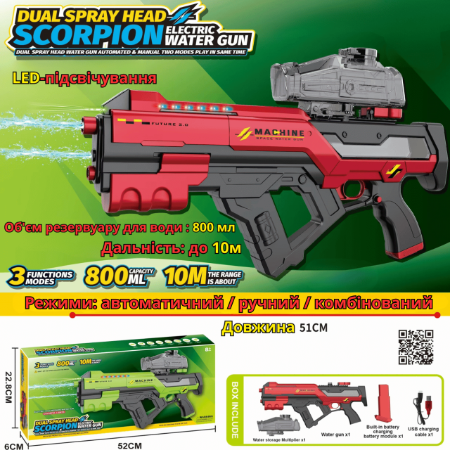 Водяной автомат Scorpion — это мощная и современная игрушка для активных игр на улице, которая подарит максимум эмоций детям и взрослым. Благодаря электрическому механизму и системе двойного распыления (Dual Spray Head) устройство обеспечивает сильную и равномерную струю воды. Встроенная подсветка делает игру еще более эффектной, особенно в вечернее время, создавая яркое визуальное сопровождение. Модель оснащена аккумулятором и удобной эргономичной рукояткой для комфортного использования. Вместительный резервуар на 800 мл позволяет дольше играть без частой дозаправки, а дальность стрельбы до 10 метров делает игру динамичной и захватывающей. Водяной автомат выполнен в стильном дизайне и отлично подходит для летних развлечений, пляжа, дачи и водных битв. Характеристики: Двойной распылитель (Dual Spray Head) Электрическая подача воды Яркая LED-подсветка 3 режима работы автоматичекский / ручной / комбинированный Дальность стрельбы до 10 метров Вместимость резервуара: 800 мл Аккумуляторная работа (USB зарядка) Размер автомата: 51×22 см Размер коробки (закрытая): 52×22.8×6 см