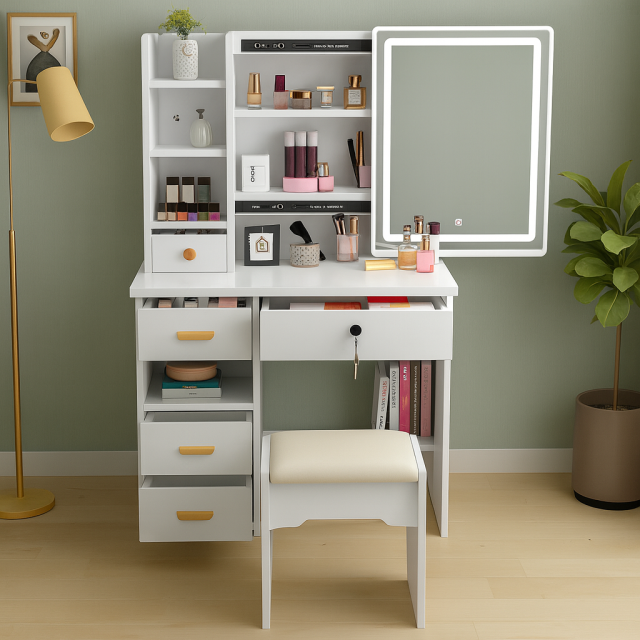 Описание Туалетный столик STL-MD 87 — это удобное и функциональное место для макияжа и ежедневного ухода. Встроенное LED-зеркало обеспечивает равномерное освещение, а продуманная система хранения помогает поддерживать порядок. Ключевые преимущества Большое зеркало с LED-подсветкой для комфортного макияжа Удобный пуфик в комплекте Вместительная столешница Комбинация выдвижных ящиков и открытых полок Нейтральный белый цвет, подходящий к разным интерьерам Технические характеристики Тип: туалетный столик с зеркалом и пуфиком Модель: STL-MD 87 Цвет: белый Материал: МДФ Форма зеркала: прямоугольная Освещение: LED-подсветка Установка: напольная Ширина: 80 см Глубина: 35 см Высота: 128 см Комплектация Туалетный столик Зеркало с LED-подсветкой Пуфик Фурнитура для сборки Инструкция