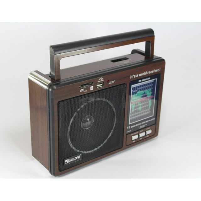 Радиоприемник-колонка MP3 GOLON RX 9966UAR Коричневый Радиоприемник-колонка MP3 GOLON RX-9966UAR — портативная акустика со встроенным аккумулятором, USB, Card Reader, радио. Система предназначена для воспроизведения музыки файлов MP3 c USB флэш накопителя и SD карт, имеет хорошее качество звука. Радио колонка MP3 GOLON RX-9966UAR может использоваться не только как радиоприемник, но и как проигрыватель Mp3 и WAV файлов с USB носителей и SD карт. Характеристики: Частотные диапазоны: AM/FM/SW1-SW9 FM 88-108 Mhz Аудио вход/выход; Заряжается от сети: 110 – 220 V 45 Hz; Поддержка форматов: MP3, WAW; Встроенный аккумулятор, хватает на 4-8часов Комплектация: Радиоприемник GOLON RX-9966UAR; Шнур питания. Упаковка