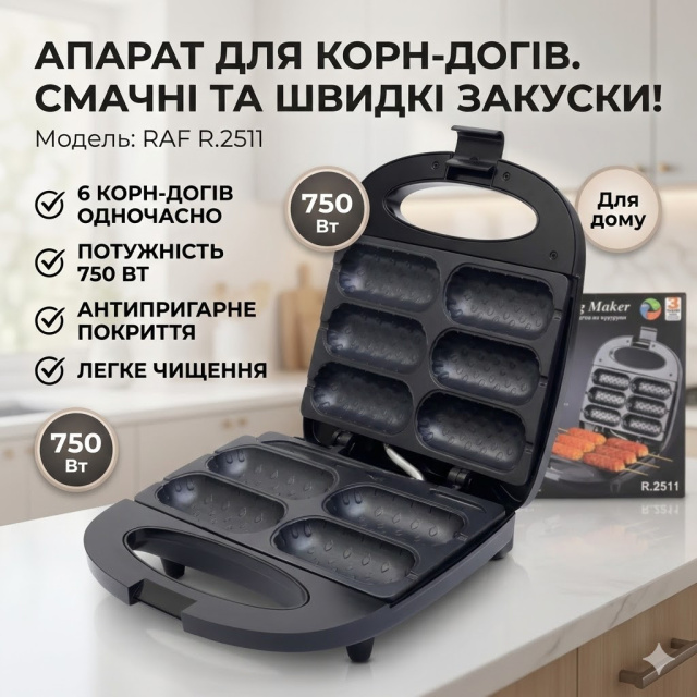 Аппарат для приготовления корн-догов RAF R.2511 - это компактное электрическое устройство, предназначенное для быстрого и удобного приготовления шести корн-догов одновременно. Мощность 750 Вт обеспечивает равномерный нагрев и стабильное приготовление закусок. Антипригарное покрытие упрощает извлечение готовых изделий и облегчает уход за прибором, позволяя быстро очистить поверхность после использования.
