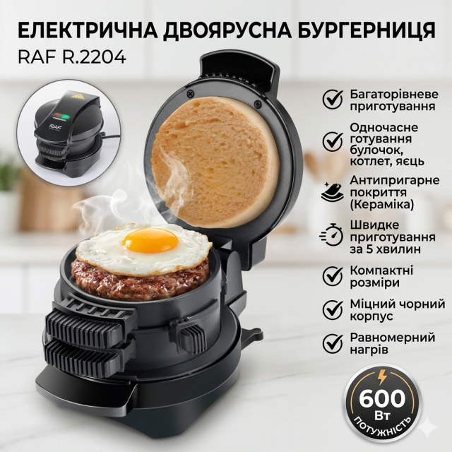 Бургерница RAF R.2204 - это компактное и удобное устройство для приготовления домашних гамбургеров, сэндвичей, маффинов и других блюд всего за несколько минут. Благодаря двухъярусной конструкции можно одновременно готовить булочки, котлеты, яйца, что значительно экономит время и упрощает процесс готовки. Антипригарное покрытие и равномерное двустороннее нагревание гарантируют идеальную прожарку продуктов без пригорания, а удобный размер позволяет легко разместить прибор на любой кухонной поверхности.