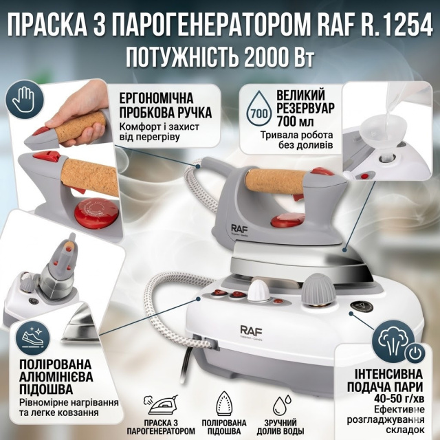 Утюг с парогенератором, алюминиевой подошвой и пробковой рукояткой RAF R.1254 2000W