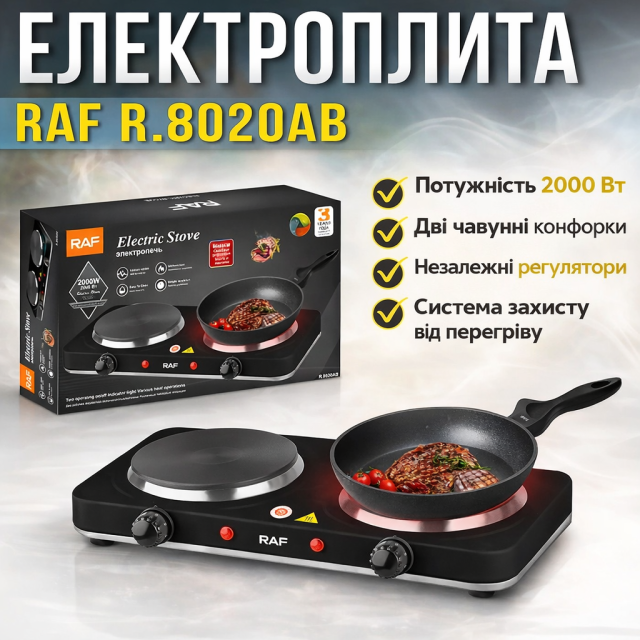 Электрическая плита RAF R.8020AB оснащена двумя конфорками с чугунными дисковыми обогревателями, которые обеспечивают равномерное распределение тепла и длительное сохранение температуры. Общая мощность устройства составляет 2000 Вт, по 1000 Вт на каждую конфорку, что позволяет готовить или разогревать несколько блюд одновременно. Компактный корпус помогает эффективно организовать рабочее пространство и делает плиту удобной для использования.