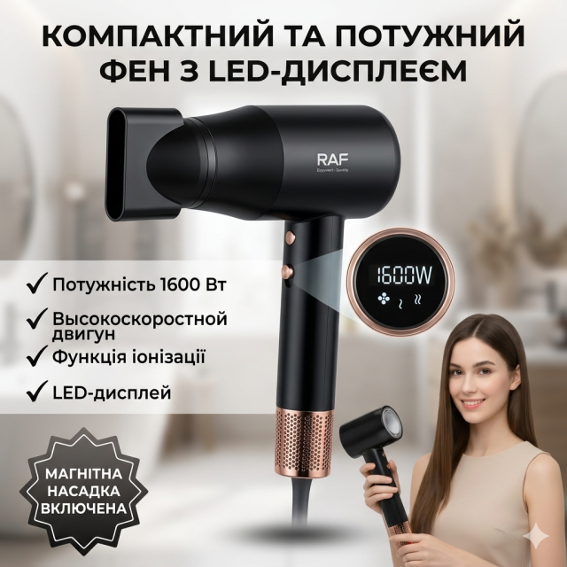 Фен для волос с тремя температурными режимами и LED-дисплеем RAF R.407 1600W